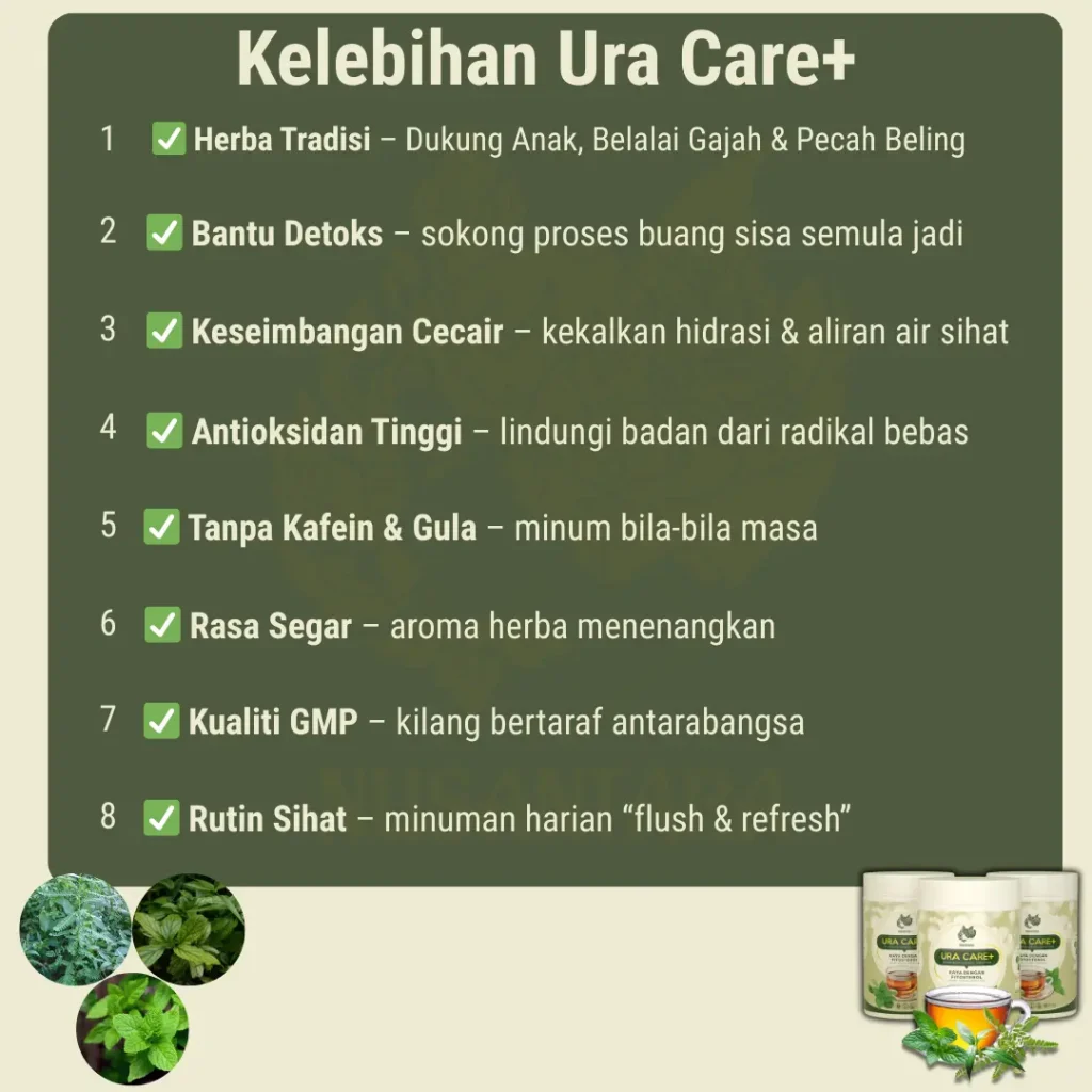 ✅ Ura Care+ ialah teh herba tradisional yang dirumus daripada tumbuhan seperti Pecah Beling, Dukung Anak & Belalai Gajah.